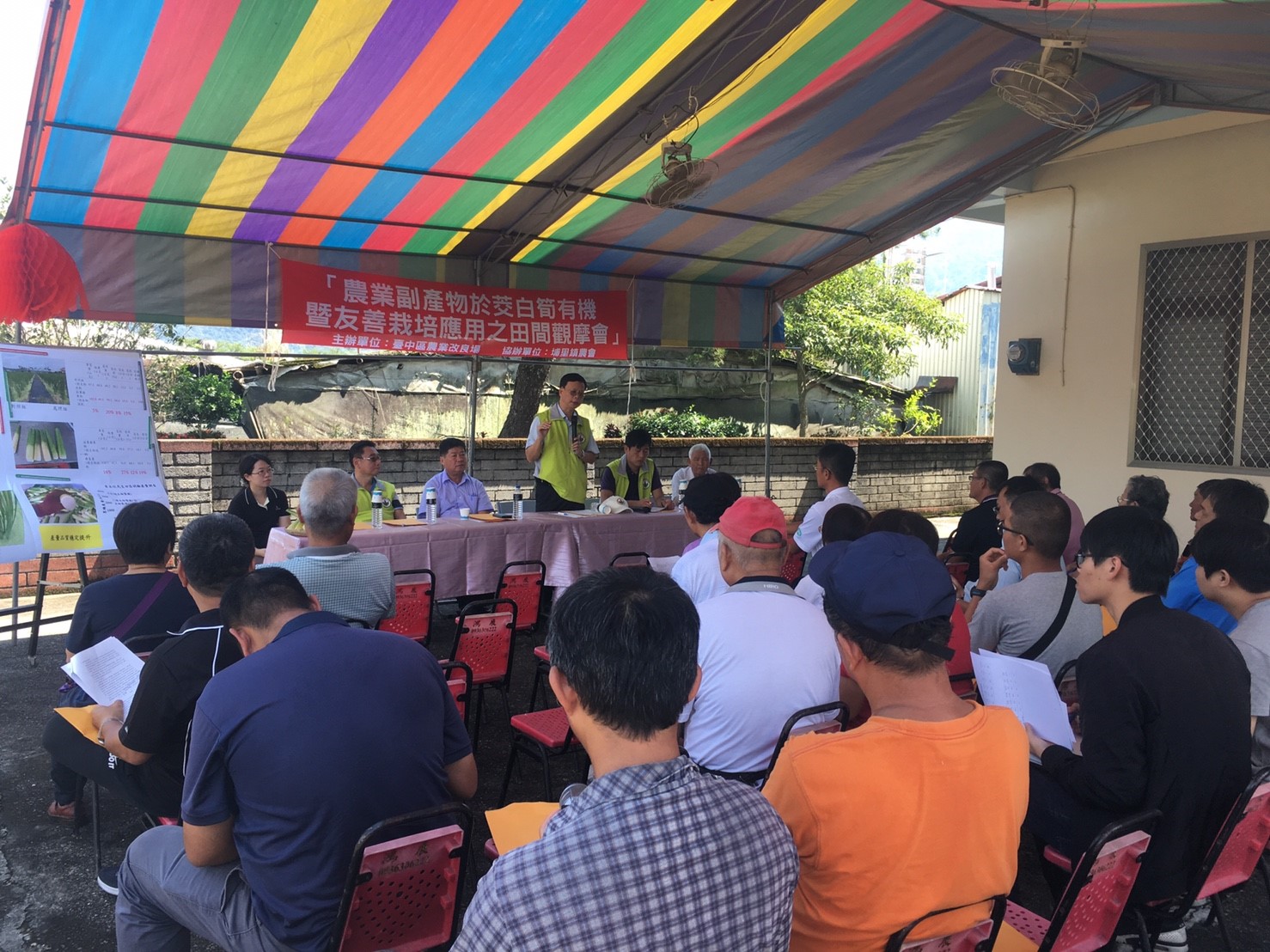 本月18日台中農改場於南投縣埔里鎮舉辦筊白筍友善栽培示範觀摩會,熟成雞糞肥及廢棄菇包施用於筊白筍田間,達成友善、有機栽種目標。